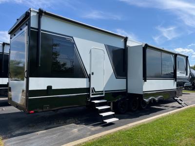 Sleeps 8 Slides 3 Length 45 ft 5 in Ext Width 8 ft 5 in Ext Height 13 ft 4 in Interior Color Sahara Exterior Color Optional Full-Body Paint; Silver & Black, White & Black, Gold & Black, Metallic Hitch Weight 3450 lbs GVWR 23000 lbs Dry Weight 18900 lbs Fresh Water Capacity 150 gals Grey Water Capacity 156 gals Black Water Capacity 85 gals Tire Size 215/75 R17.5 Furnace BTU 35000 btu Generator FlexPower 5500 Fuel Capacity 30 gals Number Of Bunks 1 Available Beds King Refrigerator Type GE Energy Star with Ice Maker and Filtered Water Refrigerator Size 19 cu ft Convection Cooking Yes Cooktop Burners 4 Shower Size 30" x 42" Number of Awnings 4 Axle Weight 7000 lbs Garage Size 11 ft LP Tank Capacity 30 lbs Water Heater Type Tankless AC BTU 40500 btu TV Info LR 65" Smart TV, Garage 43" Smart TV, BR 32" Smart TV Awning Info 13'6", 11' & 15', Rear Power w/Neon Lights Axle Count 3 Washer/Dryer Available Yes Number of LP Tanks 2 Shower Type Standard Electrical Service 50 amp Solar Wattage 800 watts Similar Toy Hauler Fifth Wheel Floorplans