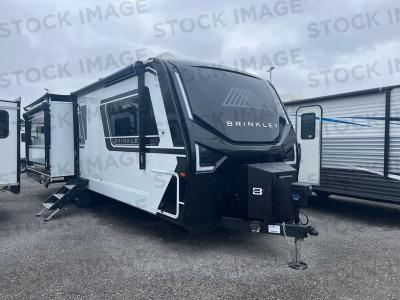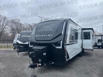 The drop frame chassis will provide a smooth tow from home to campground, and the one-touch automatic leveling system will have you set up in no time. You will love the sleek styling with automotive-grade exterior graphics, along with the square Euro frameless windows with 6" openings. Inside, there are premium residential cabinet and drawers, solid surface countertops, Brinkley's CraftSense wood trim construction, and many more premium features.