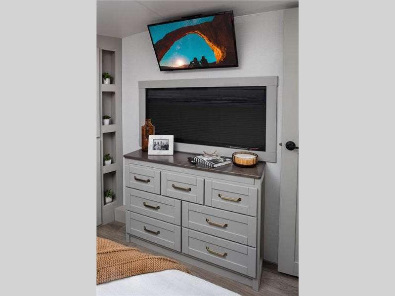 Sleeps 4 Slides 1 Length 29 ft 11 in Ext Width 8 ft Ext Height 13 ft 3 in Hitch Weight 1952 lbs GVWR 13995 lbs Dry Weight 10978 lbs Fresh Water Capacity 75 gals Grey Water Capacity 120 gals Black Water Capacity 40 gals Tire Size 17.5" Furnace BTU 35000 btu Available Beds Queen Refrigerator Type 12V Refrigerator Size 16 cu ft Cooktop Burners 3 Shower Size 30" x 42" Number of Awnings 2 Axle Weight 7000 lbs LP Tank Capacity 30 lbs Water Heater Type Tankless On Demand AC BTU 31500 btu TV Info LR 50" Articulating TV, BR 32" Smart TV Awning Info 10' and 15' 6" Electric w/Neon COB/Dotless LED Lighting Axle Count 2 Washer/Dryer Available Yes Number of LP Tanks 2 Shower Type Standard Similar Floorplans