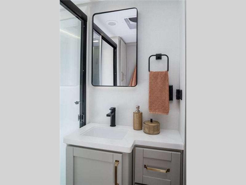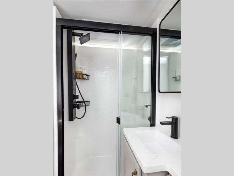 The Model Z features wide stance leveling jacks for easy set-up, an automotive grade front cap, lights and lens for a superb upscale look and feel. It also features industry first brass plumbing connections, quad entry solid steps with motion lights, and two outside hot/cold showers! On the inside, clean lines and a modern look that is both warm and inviting. There is ample storage both inside and out with tons of overhead cabinets, drawers and shelves.