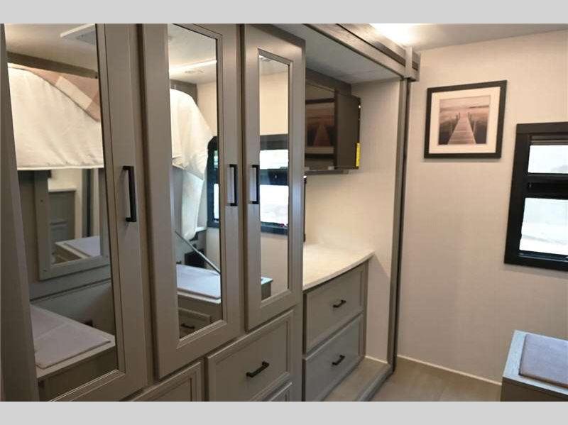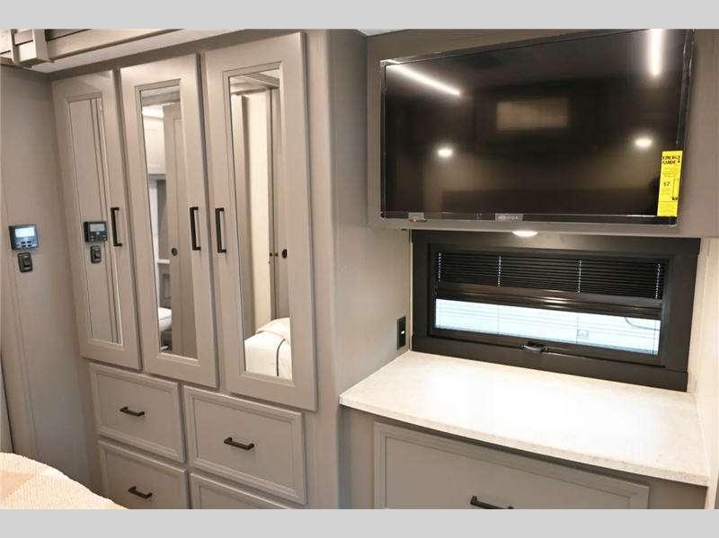 Sleeps 6 Slides 2 Length 36 ft 10 in Ext Width 8 ft 6 in Ext Height 12 ft 7 in Interior Color Chiffon, Sandcastle Exterior Color Std. Partial Paint or Full Body Options: Barcelona, Madrid, Millan, Vienna. Hitch Weight 8000 lbs GVWR 22000 lbs Fresh Water Capacity 70 gals Grey Water Capacity 45 gals Black Water Capacity 45 gals Tire Size 22.5" Furnace BTU 35000 btu Generator 5.5kw Gas Fuel Type Gasoline Engine 7.3L V8 Chassis Ford F53 Fuel Capacity 80 gals Wheelbase 242 in Number Of Bunks 1 Available Beds King Refrigerator Type Stainless Steel Residential Cooktop Burners 3 Shower Size 38" x 24" Number of Awnings 1 Axle Weight Front 8000 lbs Axle Weight Rear 15000 lbs LP Tank Capacity 20 gals Water Heater Type On Demand TV Info LR 50" Smart TV, BR 32" LCD TV, Ext. 40" TV Awning Info 20' Power Washer/Dryer Available Yes Gross Combined Weight 26000 lbs Shower Type Standard Electrical Service 50 amp Similar Floorplans