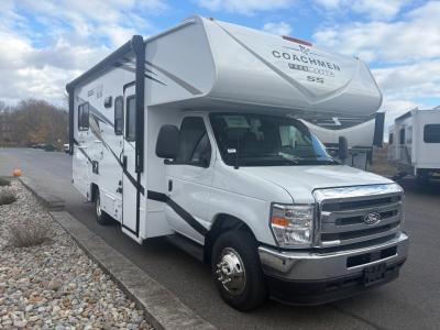Sleeps 6 Length 24 ft 5 in Ext Width 8 ft 4 in Ext Height 10 ft 10 in Interior Color Riviera, Fawn Maple Exterior Color White Fiberglass w/Graphics Hitch Weight 5000 lbs GVWR 12300 lbs Fresh Water Capacity 41 gals Grey Water Capacity 28 gals Black Water Capacity 22 gals Furnace BTU 18000 btu Fuel Type Gas Chassis Ford E-350 Fuel Capacity 32 gals Wheelbase 159 in Number Of Bunks 1 Available Beds Queen Refrigerator Type 12V Refrigerator Size 10 cu ft Cooktop Burners 3 Shower Size 24" x 32" Number of Awnings 1 Axle Weight Front 4300 lbs Axle Weight Rear 8600 lbs LP Tank Capacity 68 lbs. Water Heater Type Tankless AC BTU 15000 btu TV Info Coach 32" on Swing Arm Awning Info 15' Max-Length Power w/LED Light Strip Gross Combined Weight 20000 lbs Shower Type Standard Similar Motor Home Class C Floorplans