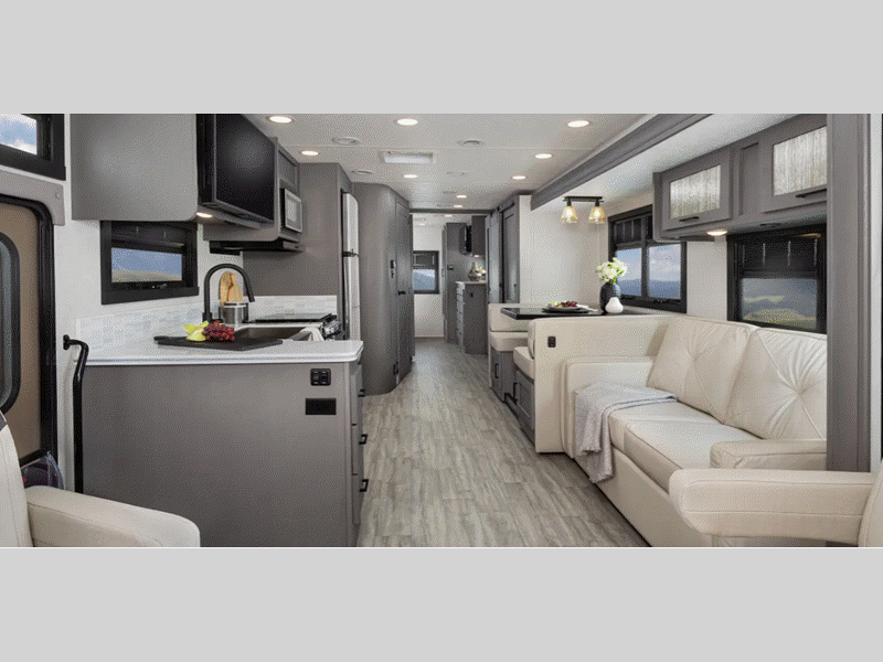 Sleeps 6 Slides 1 Length 30 ft 3 in Ext Width 8 ft 6 in Ext Height 12 ft Interior Color Champagne, Mocha Exterior Color Dove Grey Hitch Weight 5000 lbs GVWR 18000 lbs Fresh Water Capacity 50 gals Grey Water Capacity 35 gals Black Water Capacity 35 gals Furnace BTU 30000 btu Generator 5.5kW Gas Fuel Type Gas Engine 7.3L V8 Chassis Ford F53 Horsepower 335 hp Fuel Capacity 80 gals Wheelbase 190 in Number Of Bunks 1 Available Beds RV Queen Torque 468 ft-lb Refrigerator Type 12V Stainless Steel Double Door Refrigerator Size 10 cu ft Cooktop Burners 3 Shower Size 38" x 24" Number of Awnings 1 Axle Weight Front 7000 lbs Axle Weight Rear 12000 lbs LP Tank Capacity 84 lbs Water Heater Capacity 6 gal Water Heater Type Gas/Electric DSI TV Info BR LED TV, Coach Smart TV, Ext. LED TV Awning Info 20' Power Gross Combined Weight 23000 lbs Shower Type Standard Electrical Service 50 amp Similar Floorplans