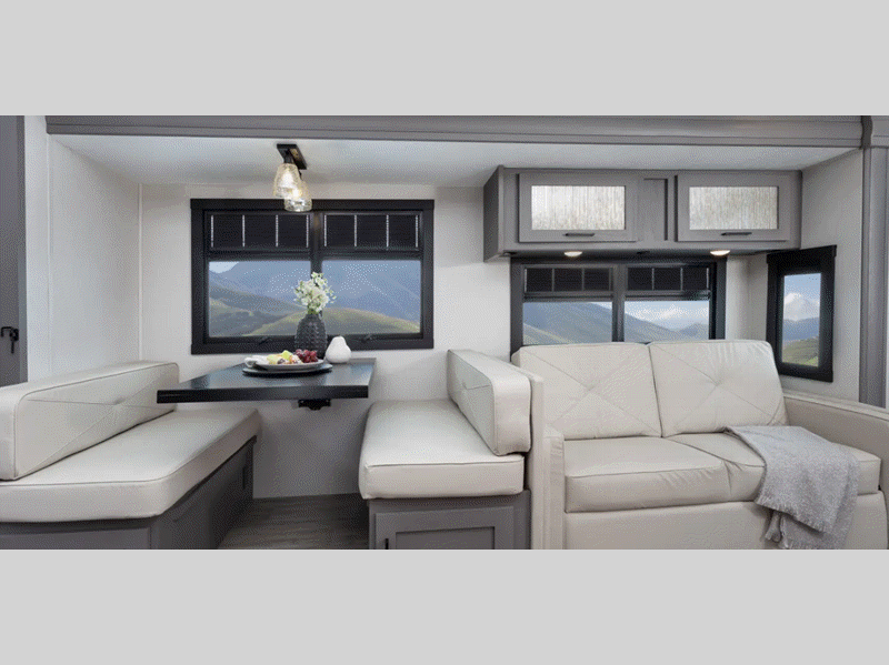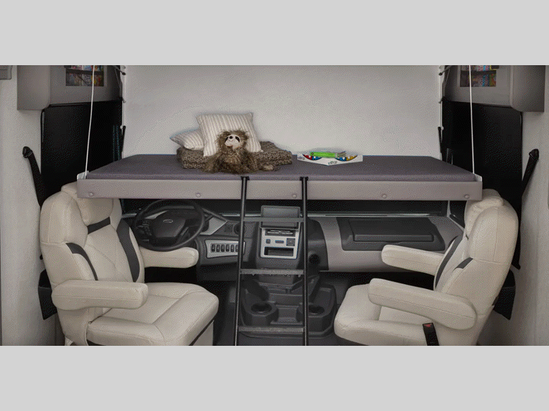 The Pursuit interior has been maximized to bring you handy features like a drop down bunk for additional sleeping space which doesn't take up extra space when not in use. You will also appreciate the computer workstation if you need to work remotely, and the power shade for the front windshield provides privacy once you're parked.