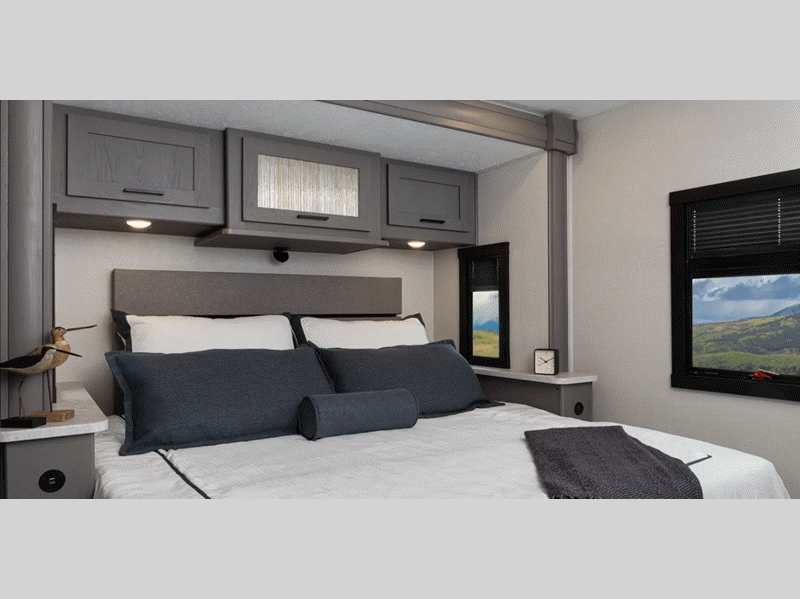 Sleeps 7 Slides 2 Length 33 ft Ext Width 8 ft 6 in Ext Height 12 ft Interior Color Champagne, Mocha Exterior Color Dove Grey Hitch Weight 5000 lbs GVWR 18000 lbs Fresh Water Capacity 50 gals Grey Water Capacity 38 gals Black Water Capacity 38 gals Furnace BTU 30000 btu Generator 5.5 kW Gas Fuel Type Gas Engine 7.3L V8 Chassis Ford Horsepower 335 hp Fuel Capacity 80 gals Number Of Bunks 2 Available Beds RV King Torque 468 ft-lb Refrigerator Type 12V Stainless Steel Double Door Refrigerator Size 10 cu ft Cooktop Burners 3 Shower Size 26" x 38" Number of Awnings 1 Axle Weight Front 7000 lbs Axle Weight Rear 12000 lbs LP Tank Capacity 84 lbs Water Heater Type On Demand TV Info LR 40" Smart TV, BR LED TV, Ext. LED TV Awning Info 17' Power Washer/Dryer Available Yes Gross Combined Weight 23000 lbs Shower Type Standard Electrical Service 50 amp Similar Floorplans
