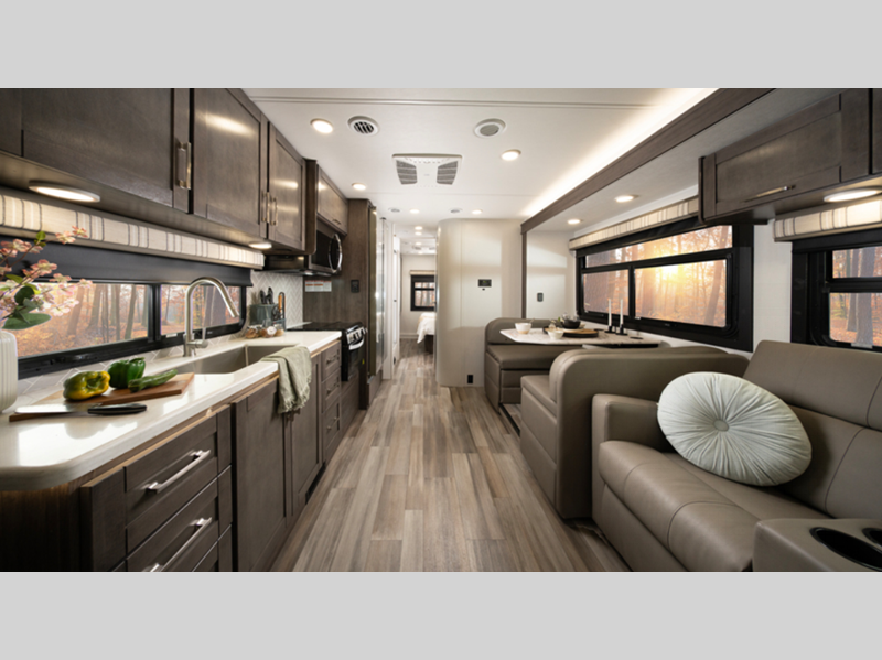 Sleeps 6 Slides 2 Length 32 ft 6 in Ext Width 8 ft 4 in Ext Height 11 ft 8 in Int Height 7 ft Interior Color Oakridge Exterior Color Std. Partial Paint. Full-Body Paint; Currant, Granite, Medallion, Midnight, Oxford Hitch Weight 7500 lbs GVWR 14500 lbs Fresh Water Capacity 47 gals Grey Water Capacity 41 gals Black Water Capacity 32 gals Tire Size LT225/75R16 Furnace BTU 30000 btu Generator 4,000W Fuel Type Gasoline Engine 7.3L V-8 Chassis Ford E-450 Horsepower 325 hp Fuel Capacity 55 gals Wheelbase 223 in Number Of Bunks 1 Available Beds Queen Torque 450 ft-lb Refrigerator Type 12V Refrigerator Size 10 cu ft Cooktop Burners 3 Shower Size 30" x 36" Number of Awnings 1 Axle Weight Front 5000 lbs Axle Weight Rear 9600 lbs LP Tank Capacity 56 lbs Water Heater Type Tankless AC BTU 15000 btu TV Info LR LED HD Smart TV, Ext. LED HD Smart TV Awning Info 16' Electric w/LED Lights Gross Combined Weight 22000 lbs Shower Type Standard Electrical Service 30 amp Similar Floorplans