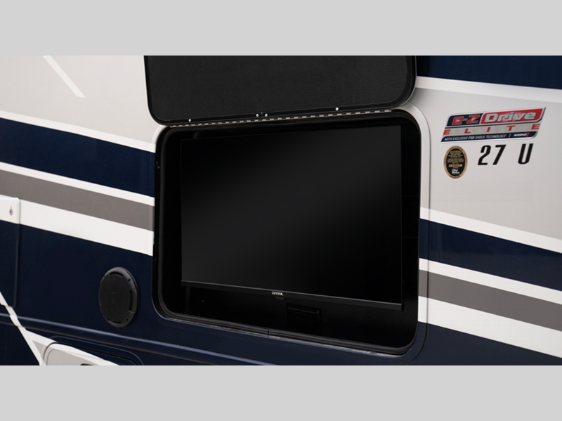 - Customer Value Package (Mandatory): E-Z Drive™ Elite; One-piece, seamless fiberglass front cap; Automotive-bonded panoramic window in front cap w/ power shade; Automatic hydraulic leveling jacks; Frameless windows; Electric patio awning w/ LED lights; Exterior LED HD Smart TV with (2) JBL® high-output, marine-grade exterior speakers; 1,000W inverter; Chrome, heated, remote-controlled, side-view mirrors; Sony® infotainment center, Apple CarPlay® & Android Auto™; Backup & side-view cameras; LED-lit, solid-surface kitchen countertop