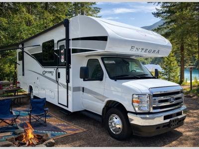 The Odyssey SE Class C gas motorhome by Entegra Coach is constructed with TuffShell vacuum-bond laminated sidewalls, a one-piece, seamless fiberglass front cap, and bead-foam insulation for added durability and strength. Whether you choose a model with a Ford E-350 chassis, Ford E-450 or Chevy 4500 chassis, you will get a durable coach made to last. The driver will also love the power steering, tilt steering wheel, and auxiliary start switch. The 7' interior ceiling height will provide plenty of space to stretch out and the high-intensity, recessed LED lights will make your space feel more like home. All of your power needs will be met with a 4,000-watt generator and 12V house battery, plus there is a 13.5K BTU A/C and 30K BTU furnace to keep you comfortable all year long. There are a couple additions you might want to add to further customize your Odyssey SE, like the optional automatic hydraulic leveling jacks and the optional 200W solar panel for some off-grid camping!