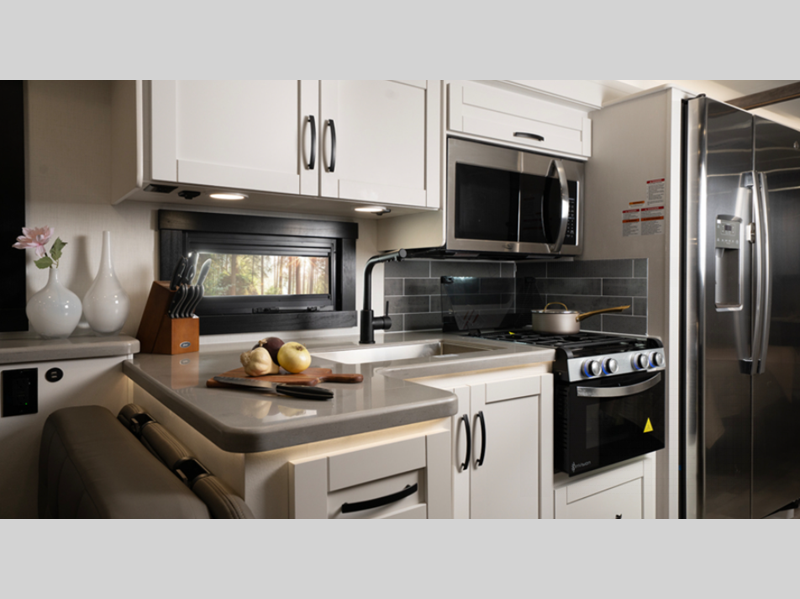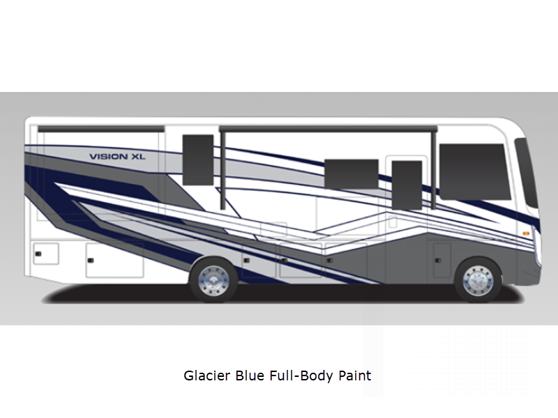 Sleeps 5 Slides 2 Length 33 ft Ext Width 8 ft 5 in Ext Height 12 ft 10 in Int Height 7 ft Interior Color Benton, Farmhouse Exterior Color Standard Graphics. Full-Body Paint; Glacier Blue, Harbor Grey, Lava Rock, Thunder Hitch Weight 5000 lbs GVWR 22000 lbs Fresh Water Capacity 72 gals Grey Water Capacity 40 gals Black Water Capacity 50 gals Tire Size 22.5" Furnace BTU 30000 btu Generator 5,500-watt with Auto-Gen Start Fuel Type Gas Engine 7.3L V8 Chassis Ford F53 Horsepower 335 hp Fuel Capacity 80 gals Wheelbase 228 in Available Beds King Torque 468 ft-lb Refrigerator Type Residential Cooktop Burners 3 Shower Size 30" x 36" Number of Awnings 1 Axle Weight Front 8000 lbs Axle Weight Rear 15000 lbs LP Tank Capacity 16.5 gals Water Heater Type Tankless AC BTU 28500 btu TV Info LR 50" LED HD Smart TV, BR LED HD Smart TV, Ext. LED HD Smart TV Awning Info 16' Electric with LED Lights Gross Combined Weight 26000 lbs Shower Type Standard Electrical Service 50 amp Similar Floorplans