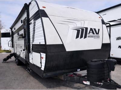 The Momentum MAV toy hauler travel trailers by Grand Design are designed to provide exactly what you need. The spacious garage provides tons of cargo space, with no wheel wells to get in the way. Additional storage includes magnetic storage door catches, and overhead consoles throughout. Conveniences like motion sensor lights and USB outlets will make your life easier, and you will be comfortable in all seasons with the 30K BTU furnace plus 15K BTU ducted air conditioning. The standard Solar Package comes with a 180W solar panel, a 40 Amp charge controller with Bluetooth, and a 12V refrigerator so you can go off-grid when the adventure calls for it.