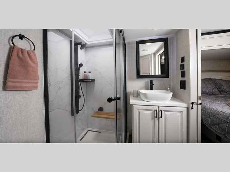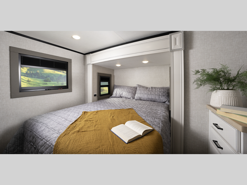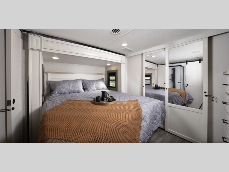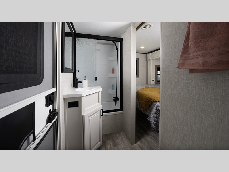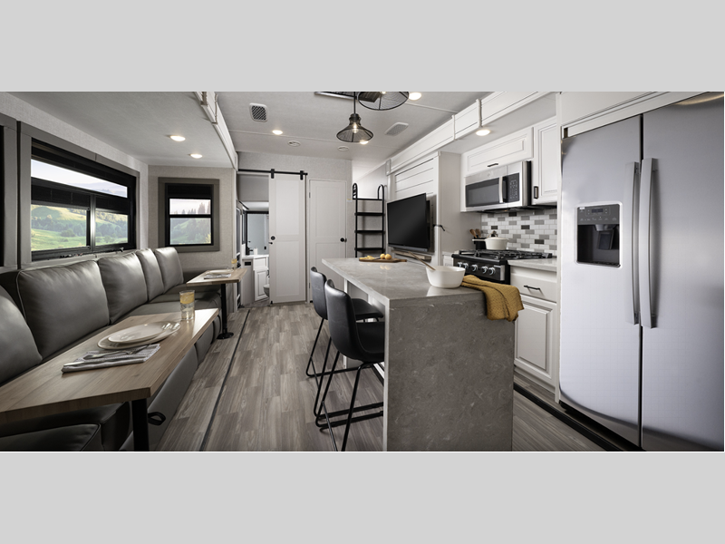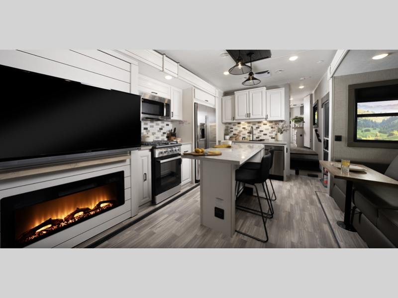They come equipped with an impressive three 15,000 BTU A/C with quiet residential return air and a mandatory Four Seasons Package that will ensure your comfort year around, plus there are GE Profile kitchen appliances that give a residential touch to your space. The durable construction that includes a PVC roofing membrane will help extend the life of your fifth wheel, and the VoiceLINK command system will put you in control of lighting, heating, and cooling for added convenience.