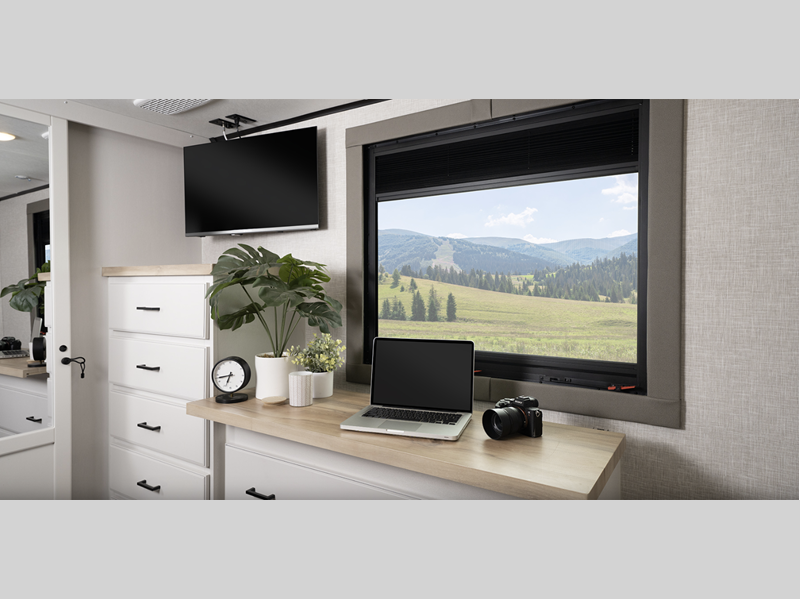 Sleeps 8 Slides 4 Length 43 ft 9 in Ext Width 8 ft 6 in Ext Height 13 ft Interior Color Coastal Linen Hitch Weight 2930 lbs GVWR 16300 lbs Dry Weight 14030 lbs Cargo Capacity 2270 lbs Fresh Water Capacity 75 gals Grey Water Capacity 97 gals Black Water Capacity 40 gals Tire Size ST235/80R16H Furnace BTU 40000 btu Number Of Bunks 1 Available Beds King Refrigerator Type GE Residential Refrigerator Size 21 cu ft Cooktop Burners 4 Number of Awnings 2 LP Tank Capacity 40 lbs Water Heater Capacity 16 gal Water Heater Type Gas/Electric AC BTU 45000 btu TV Info LR Smart HDTV, BR 32" TV Awning Info 10' and 18' Power w/LED Lighting Axle Count 2 Washer/Dryer Available Yes Number of LP Tanks 2 Shower Type Standard Electrical Service 50 amp Similar Floorplans