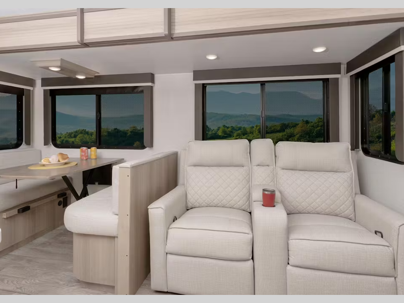 Sleeps 8 Slides 3 Int Height 6 ft 6 in Interior Color Liam, Cashmere Furnace BTU 35000 btu Number Of Bunks 1 Available Beds Queen Refrigerator Type 12V GE Refrigerator Size 10 cu ft Cooktop Burners 3 Shower Size 34" Number of Awnings 1 Axle Weight 5100 lbs Garage Size 8 ft 4 in LP Tank Capacity 30 lbs Water Heater Type On Demand AC BTU 15000 btu TV Info LR 40" HDTV Awning Info 21' Power Lighted w/Adjustable Arms Axle Count 2 Number of LP Tanks 2 Shower Type Radius Electrical Service 50 amp Similar Floorplans