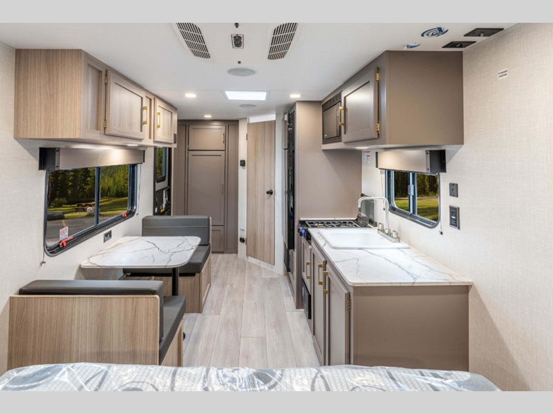 Each model includes residential grade linoleum, tons of storage space, and rail-style cabinet doors with modern handles. You will appreciate the digital media stereo with Bluetooth, USB ports for your phone or tablet, and an omnidirectional HDTV antenna with Wi-Fi prep if you need to get some work done while you're away from home. The Sportsmen Classic has R-7 insulation in the sidewalls, tinted windows, and self-adjusting electric brakes.
