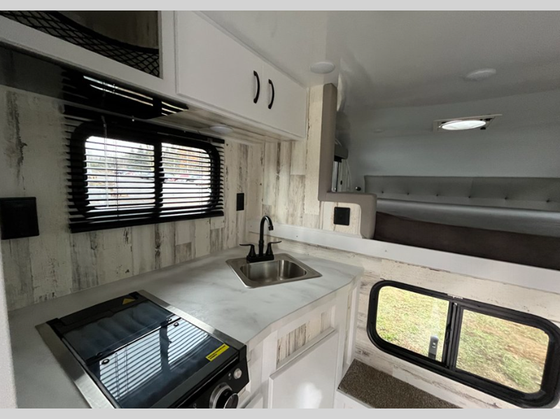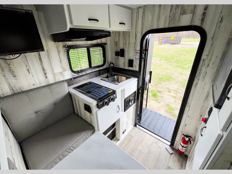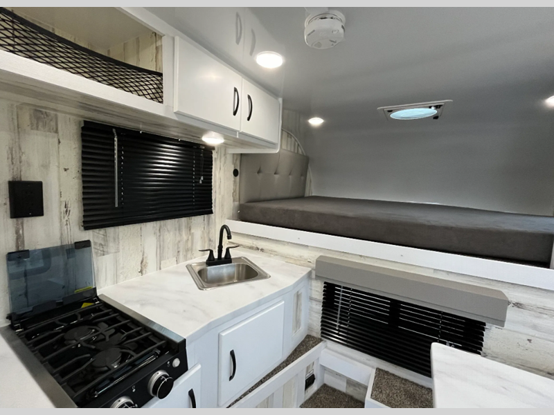 There is comfortable sleeping arrangements, plenty of storage spaces, and a fully-equipped kitchen allowing you to make meals each day. A tankless on-demand water heater and outside spray port shower box let you quickly freshen up after a hike, and you can choose to add the optional 13.5 BTU A/C for even more comfort. This truck camper is constructed with Azdel in the walls, roof and ceiling for added durability, and protection against the elements.
