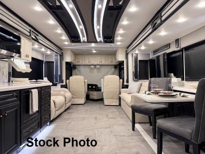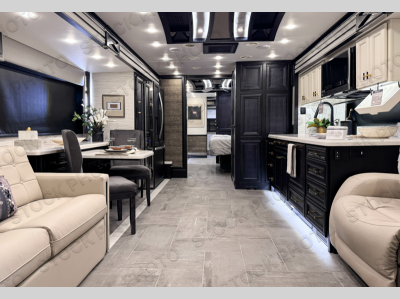 Fours slides, a bath and a half, plus sleeping space for six make this coach family  friendly. There are two sofa beds in the main living area, plus a lift TV for your favorite shows. The chef of your group can cook meals on the two burner induction cooktop or in the stainless steel convection microwave with an air fryer, and there is a drawer-type dishwasher that will make clean up easier than ever. This model also includes a residential refrigerator plus pull-out storage and a stack of drawers for snacks galore. Enjoy a great night's rest on the king bed after traveling all day, and the full rear bath will allow you to clean up in luxury. There is even a floor-to-ceiling closet for maximum storage and a stacked washer and dryer; how convenient!