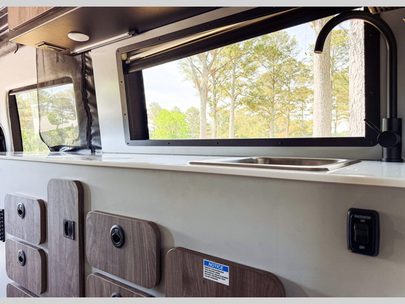 The 2.0L 4-cylinder twin-scroll turbo diesel engine delivers 208HP and 332 lb-ft of torque, providing smooth and efficient performance. Plus, the 3,000-watt Victron pure sine wave inverter/charger with smart shunt ensures accurate state-of-charge tracking, keeping your systems powered. The interior boasts overhead cabinets with 110V outlets, 12V USB, and 12V cigarette lighter outlets, as well as a roof access port in the living area, and a shower skylight brings in natural light, creating a bright and airy atmosphere.