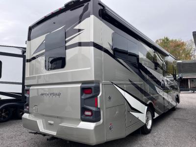 You'll love how easy it will be to maneuver this coach since it comes in at only 32-feet in length! The full-wall slide will open up your space so you can cook on the three burner range and dine at the booth dinette-sleeper. There is also a residential refrigerator and a pantry for food storage plus a bedroom wardrobe with drawers within the slide to keep your thing tidy. Once dinner is cleaned up, you can relax on the theater seating across from the wall mounted TV, or head outdoors to visit under the Girard power awning with LED lights. You're sure to get a great night's rest on the king bed, while your guests sleep on the booth dinette-sleeper. And if you're needing additional sleeping space, just choose the optional drop-down cab bunk!