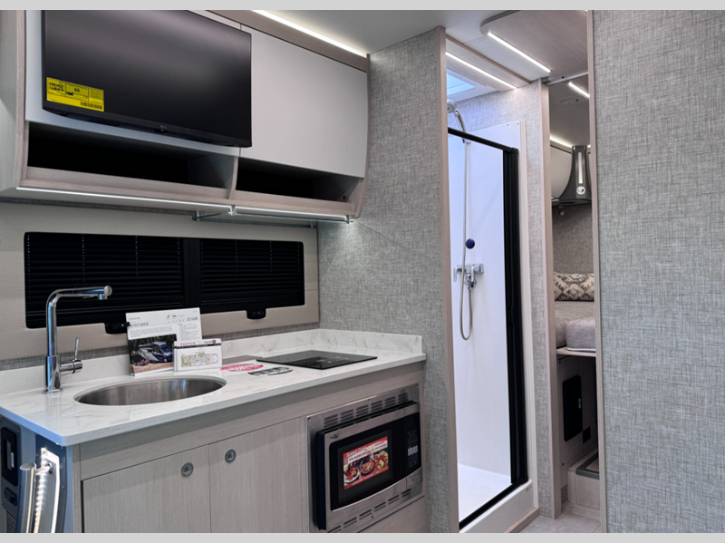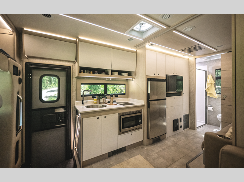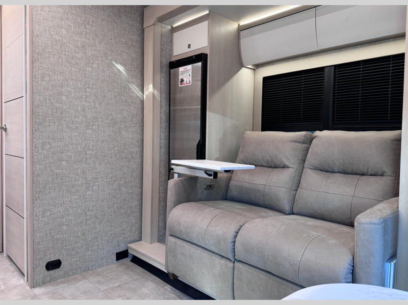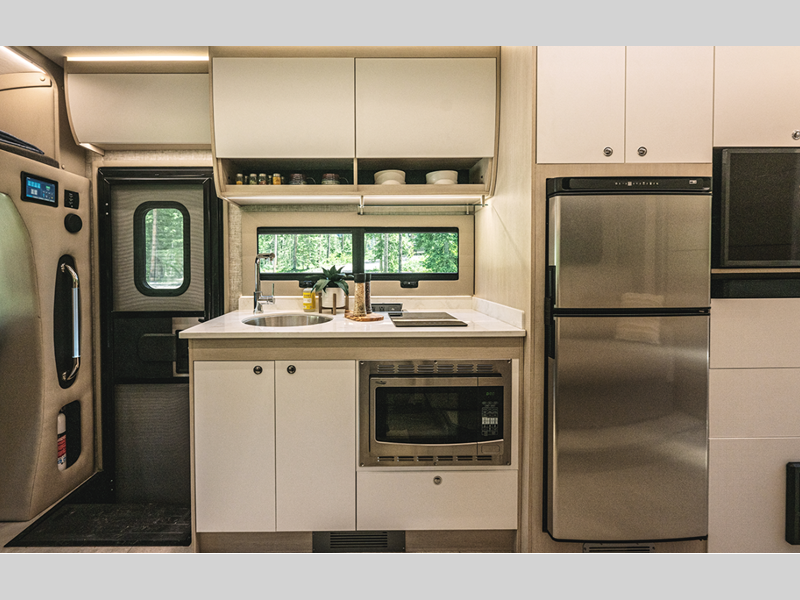 Each coach is built on a Mercedes-Benz 3500 XD dual wheel cutaway chassis with load adaptive electronic stability along with attention, traffic, active brake and lane keeping assist for safety. The chassis also has the SumoSprings ride assist system and the Lippert hydraulic leveling system for smooth driving and set up. Inside, you will love the handcrafted overhead cabinetry, dimmable LED lighting, solar and privacy shades, and many more comforts!