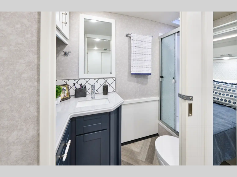 Sleeps 5 Slides 2 Length 35 ft 6 in Ext Width 8 ft 6 in Ext Height 12 ft 1 in Int Height 6 ft 10 in Interior Color Organic Comfort Dark, Organic Comfort Light, Bohemian Oasis Exterior Color Full-Body Paint; Silvermist, Wedgewood ll, Steel Grey, Night Sky Hitch Weight 5000 lbs GVWR 22000 lbs Fresh Water Capacity 75 gals Grey Water Capacity 57 gals Black Water Capacity 48 gals Tire Size 22.5" Furnace BTU 40000 btu Generator 5,500-Watt Cummins Onan Marquis Gold Fuel Type Gas Engine 7.3L V8 Chassis Ford F-53 Fuel Capacity 80 gals Wheelbase 228 in Available Beds King Refrigerator Type Stainless Steel Residential with Ice Maker and Water Dispenser Convection Cooking Yes Cooktop Burners 2 Shower Size 34" x 34" Number of Awnings 1 Axle Weight Front 8000 lbs Axle Weight Rear 15000 lbs LP Tank Capacity 76.14 lbs Water Heater Capacity 10 gal Water Heater Type 110V/LP AC BTU 28500 btu Basement Storage 122 cu. ft. TV Info LR 50" HDTV, BR 32" HDTV, Ext. 32" HDTV Awning Info 19' Power w/LED Lighting Washer/Dryer Available Yes Gross Combined Weight 26000 lbs Shower Type Radius Electrical Service 50 amp Similar Floorplans